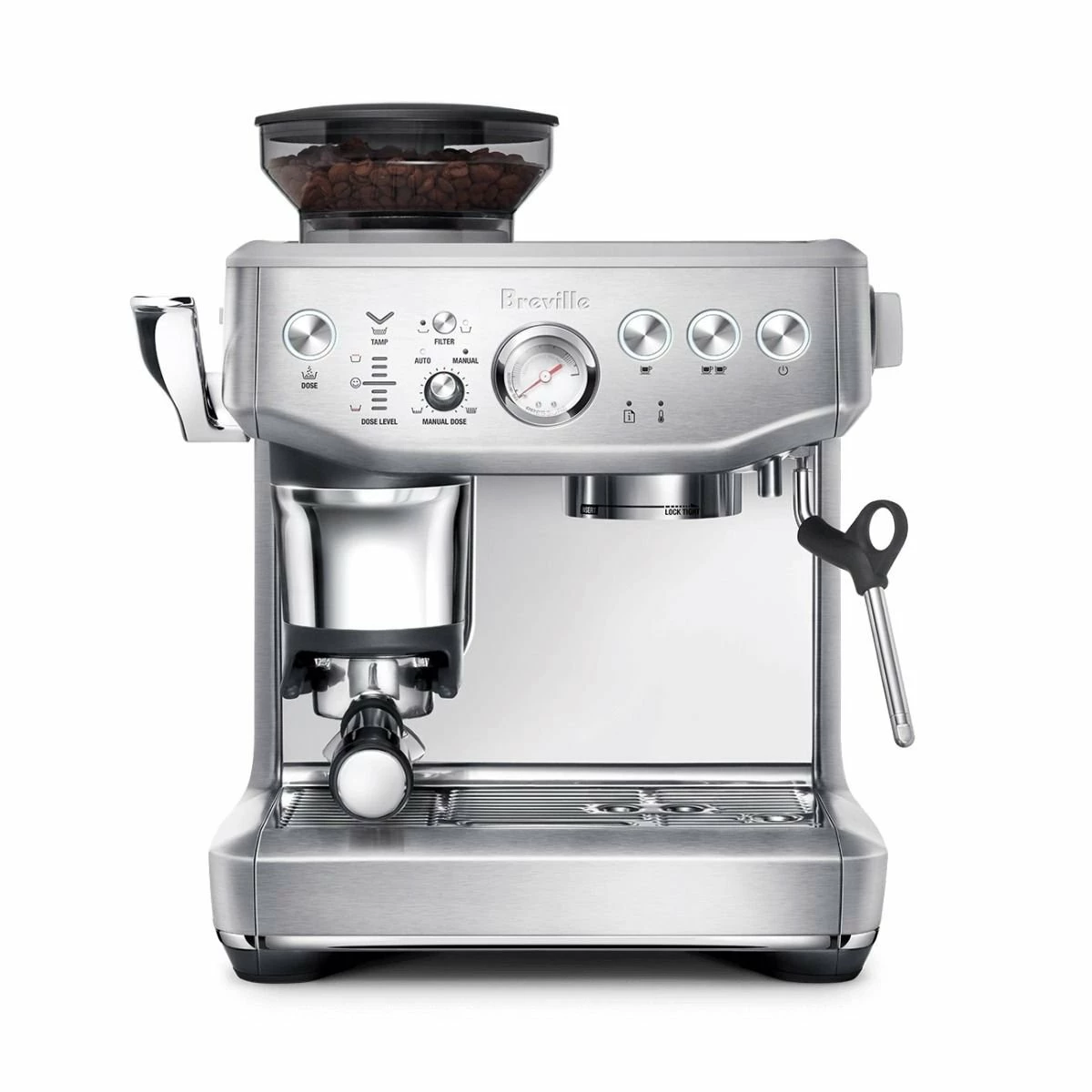 Skip the cafe line and prepare your own high-quality third-wave coffee beverages from home with Brevilles Barista Express Impress Espresso Machine! Designed to execute each of the 4 keys necessary to create a cafe-quality latte from home, this stainless steel espresso machine saves you time and money on busy weekdays or lazy weekend mornings. The conical burr grinding system precisely grinds beans to your desired coarseness, while the assisted tamping delivers a perfectly pressed 22 lbs of pressure for a clean, polished coffee puck. The expert Thermocoil heating system quickly heats water to 200° F without overheating, ensuring grounds are never burnt or bitter. For optimal espresso extraction, the Barista Express Impress is powered with a 15-bar high-pressure pump – resulting in a flavorful pour with a frothed crema for a satisfying mouth-feel. Prefer to elevate your pour with added flavors or milk? The integrated steam wand powerfully delivers 266°F steam to create velvety smooth microfoams that aid in creating bold flat whites, flavorful cappuccinos, and more! With the ability to produce virtually any coffee shop classic, the Barista Express Impress Expresso Machine is the perfect addition to any coffee connoisseur’s kitchen.