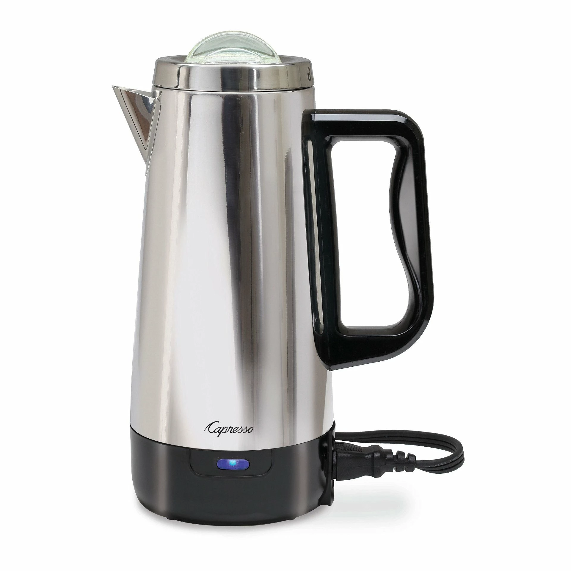 Enjoy a rich coffee blend without the cafe bill with Capresso’s Electric Coffee Perk! This contemporary design is modeled after the classic coffee percolator for easy use. Simply fill the elegant steel carafe with water and coffee, plug the unit in, and brew. With Capresso’s rapid-brew technology, this percolator can brew 12 cups of deliciously smooth coffee in less than 10 minutes. Capresso’s Stainless Steel Coffee Perk is ideal for parties, busy mornings, and office environments.