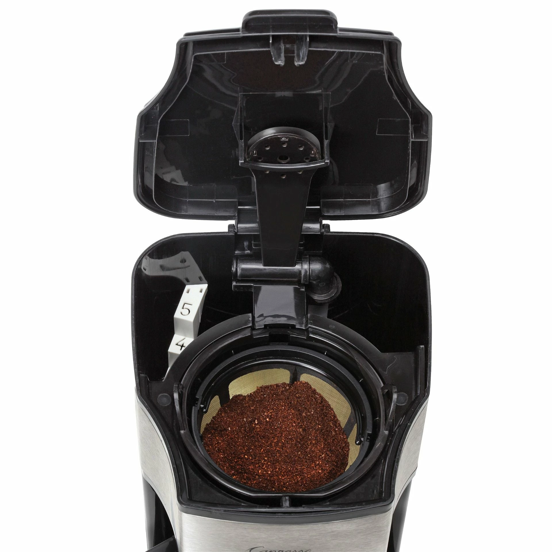 Rejuvenate the state of your day with a cup of coffee made when you need it to be made. With Capresso’s Programmable Drip Coffee Maker, you have the option to program the 24-hour timer to have your coffee ready just in the nick of time or right on time. This drip coffee maker includes a 5-cup carafe to help you meet your daily coffee needs. The easy-to-clean filter saves you time and money, eliminating the need for wasteful, disposable filters. Simply fill the water tank up to 5 cups using the internal level, and when ready, flip it on. All that’s left to do is wait a few minutes or more for that warm, comforting brew. So, start your day off right with a steamy cup of homemade coffee made with the Programmable Drip Coffee Maker by Capresso.