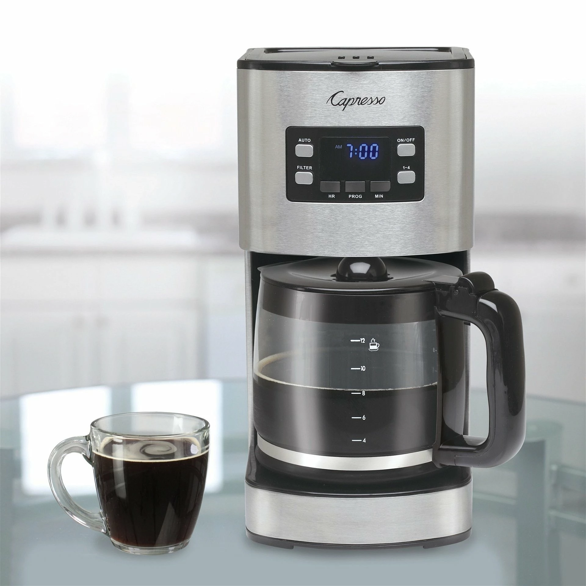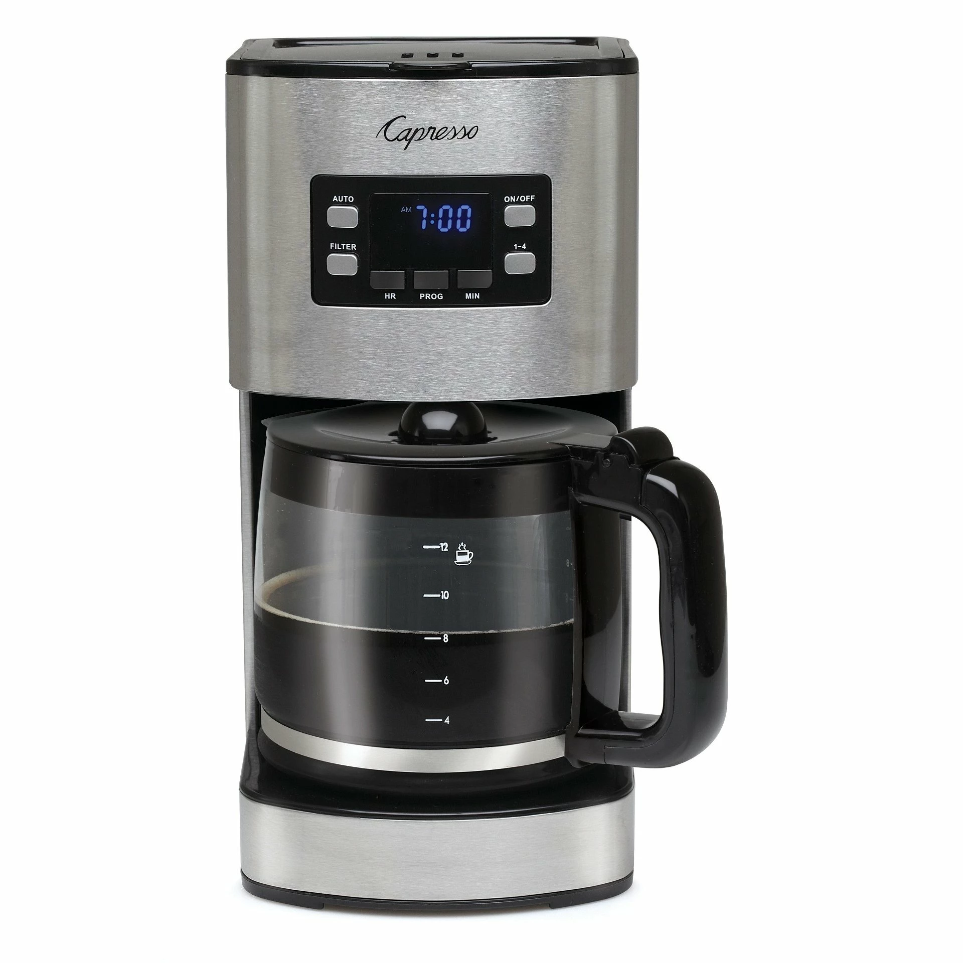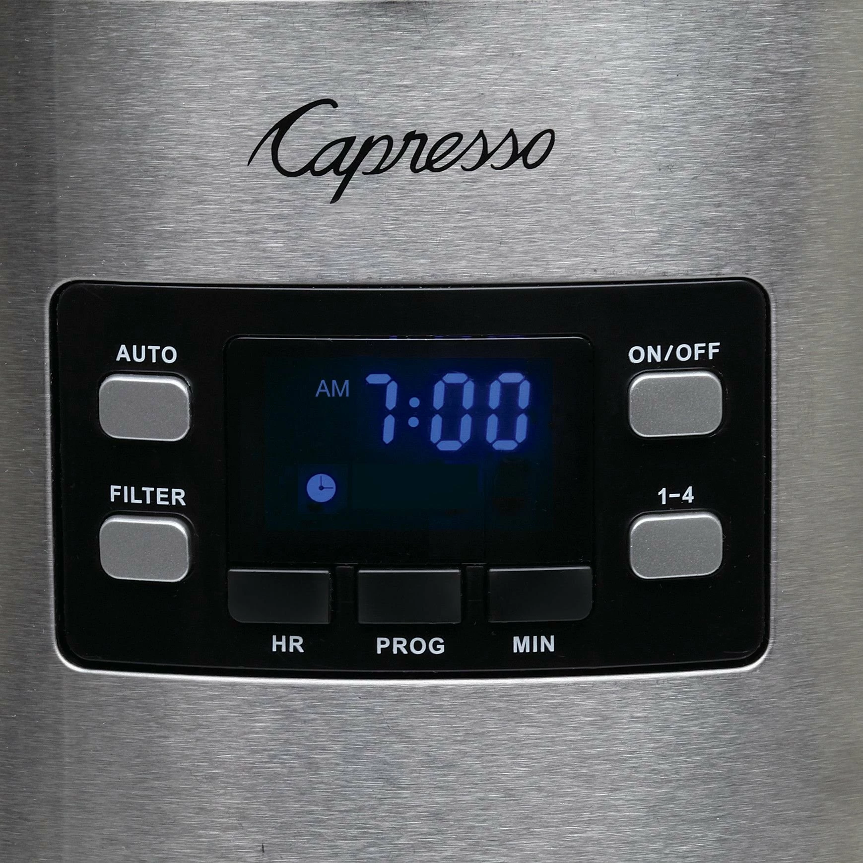 Capresso SG300 Stainless Steel Coffee Maker is coffee innovation for the true coffee lover. Brew a full carafe or an individual custom cup of coffee or tea, using the innovative cup-to-carafe® brewing system. The easy to read LED display screen is designed to read your mind, almost! Thoughtful, programmable features include bedtime brew time set, aroma protection for smaller batches, and a 2-hour auto safety shut-off for your peace of mind. Freedom from your warming plate is as important as the quality of your brewing water. The charcoal water filter removes up to 82% of chlorine and other impurities from tap water. Drip stop gives you a fast cup of coffee before you walk the dog. This compact kitchen appliance operates like a personal assistant and looks gorgeous on your countertop.
