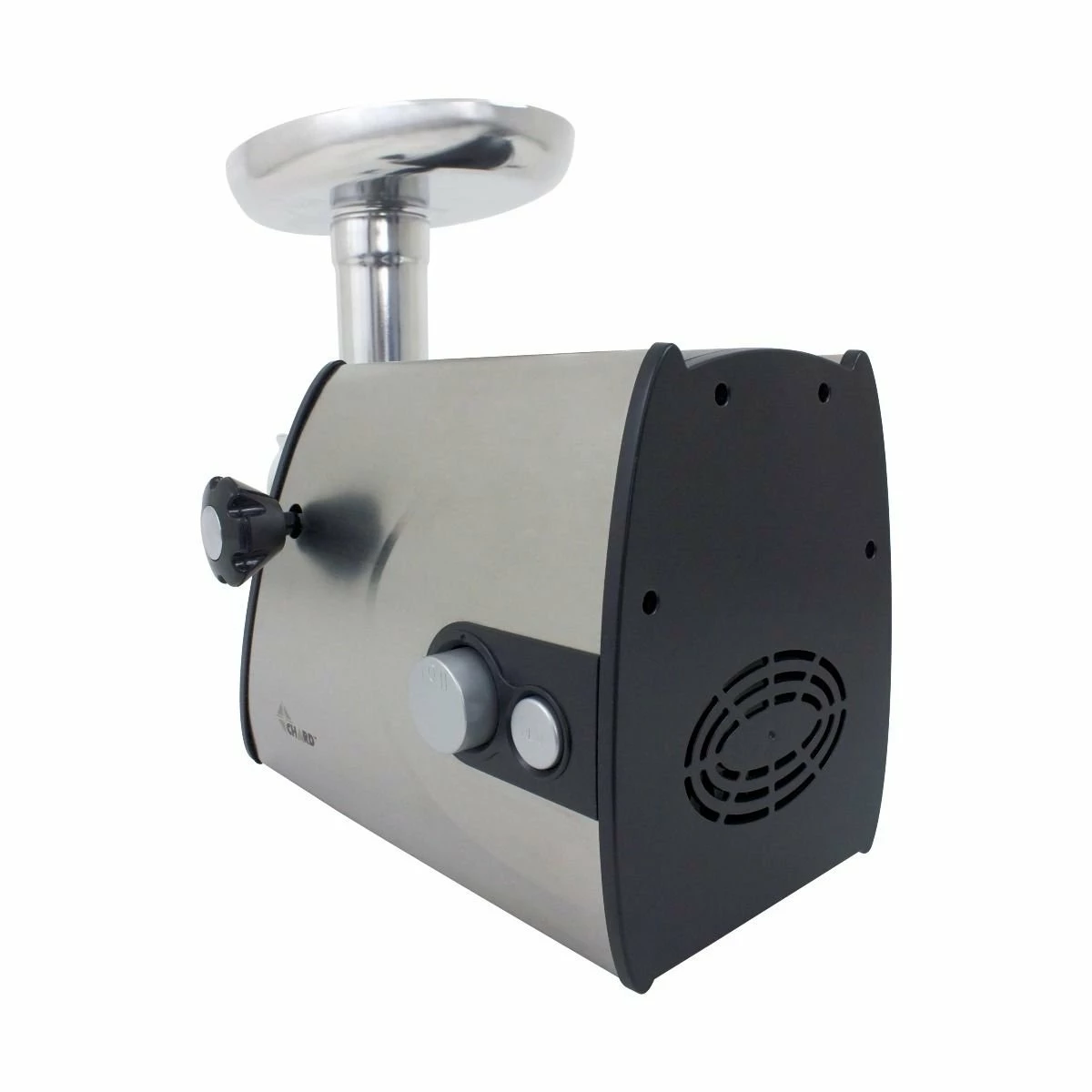 Grind meat for homemade burgers, brats and sausages with the Electric Grinder from Chard. Constructed from tough alloy steel, this grinder has a powerful 400 watt motor that can accommodate up to 2.5 pounds of meat per minute. The #8 sized grinding head with oversized hopper and food pusher makes inserting and processing the meat easy and efficient, and to ensure continuous use, the reverse function helps prevent jamming on larger chunks. Choose between the fine and medium sintered steel grinding plates and cast cutting blade. Also included are one sausage stuffing tube with three stuffing plate attachments. Perfect for hunters and homesteaders, the Chard Stainless Steel Electric Grinder will keep your freezer well-stocked with all the ground meat you can eat for years of reliable use!