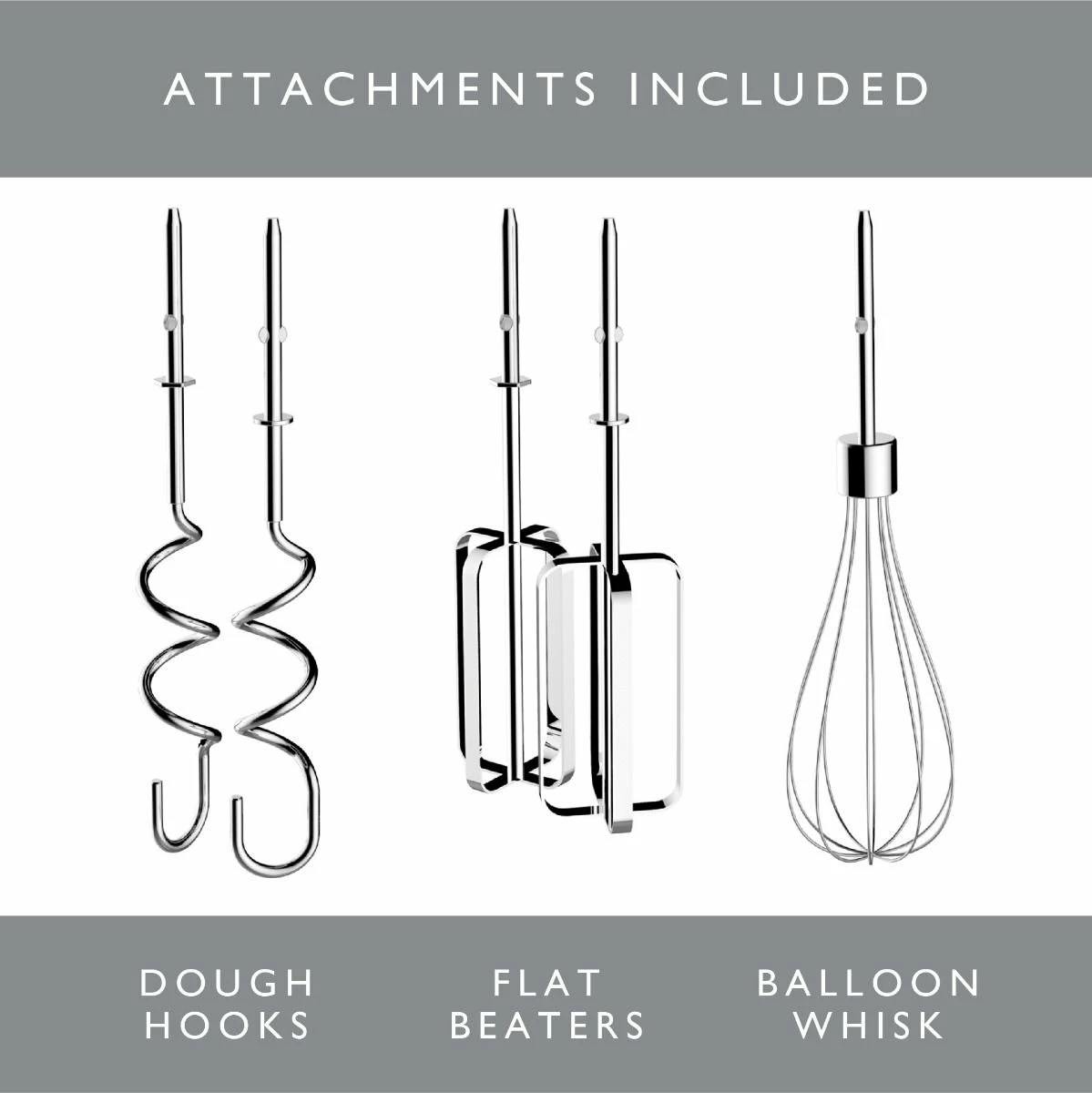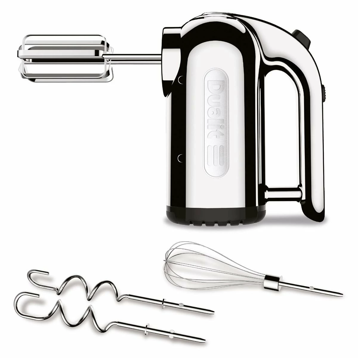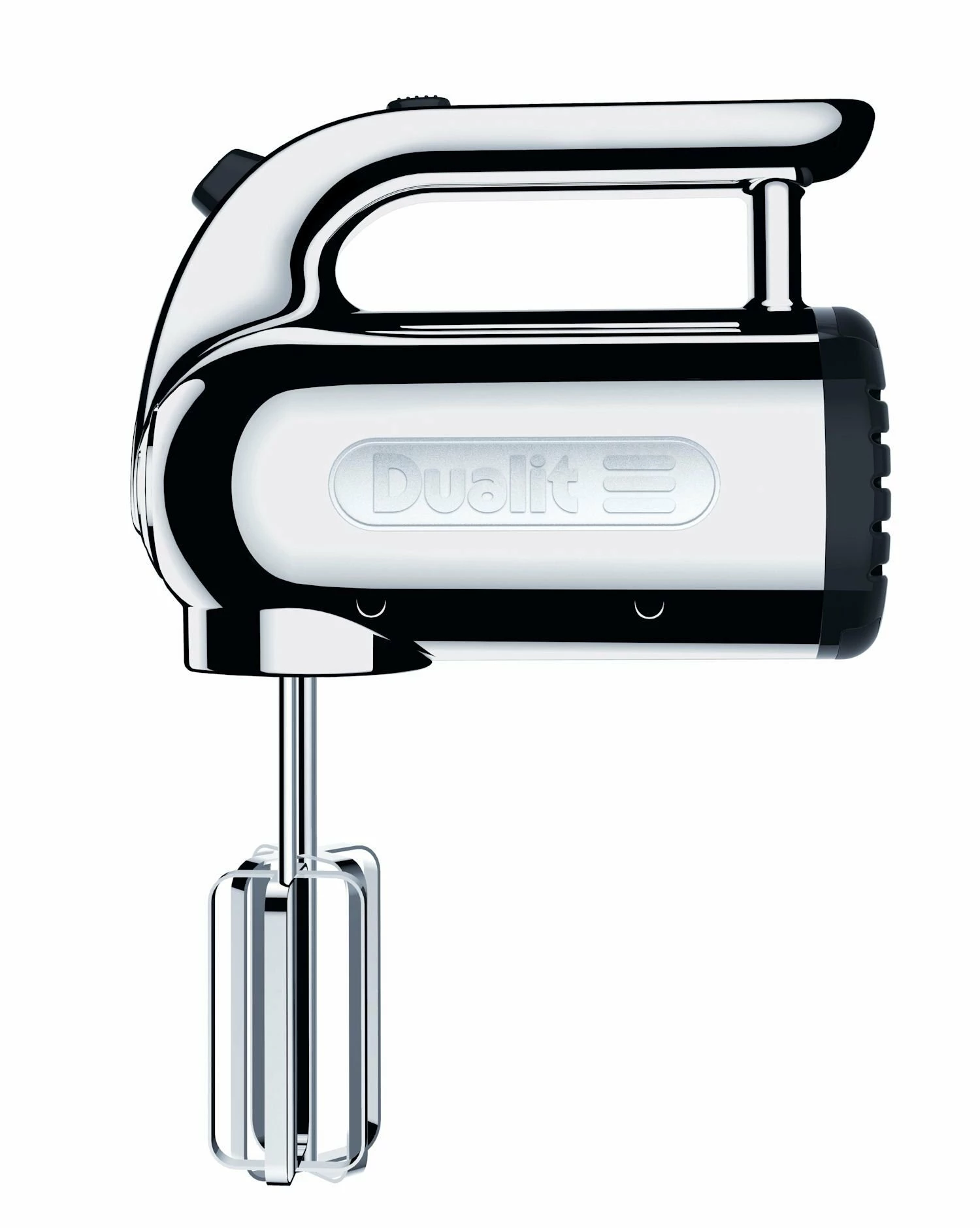 Dualit Chrome Hand Mixer Includes one pair of multipurpose flat beaters, one pair of dough hooks, and one balloon whisk to help you with all your mixing jobs. Whisk egg whites, knead bread dough or create the perfect mashed potato, you can do it all with this Dualit Hand Mixer.
