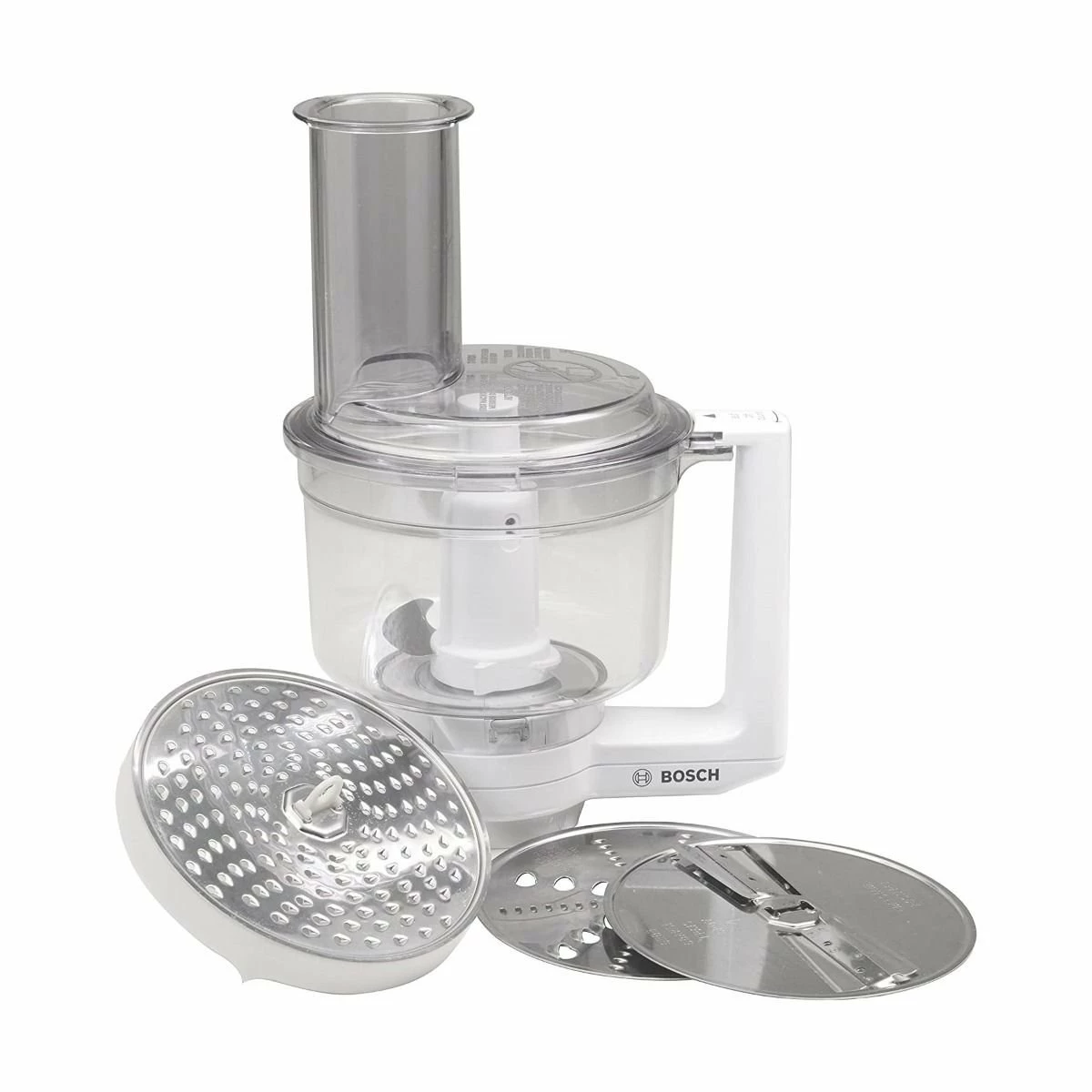 Your Bosch Compact Mixer can also be used to chop, grind, puree, mix, and blend ingredients for many meals with the Bosch Compact Mixer Food Processor Attachment! Made from plastic, the food processor attachment has a generous 5-cup capacity to whip up mashed potatoes, grind chickpeas for roasted garlic & red pepper hummus, make dips & pestos, shred cheese, or prepare warm & hearty soups. Included with the food processor attachment are three slicing/shredding disks used at the top of the bowl: a slicing disk (reversible for thin & thick slices), a shredding disk (reversible for fine & coarse shredding), and a fine grating disk. It must be noted that this particular attachment is only compatible with the Compact Mixers and not the Universal or Universal Plus mixers. With a one-year manufacturer’s warranty, the Bosch Compact Mixer Food Processor Attachment will be a game changer in your kitchen, allowing you to prepare a variety of dishes for many occasions!
