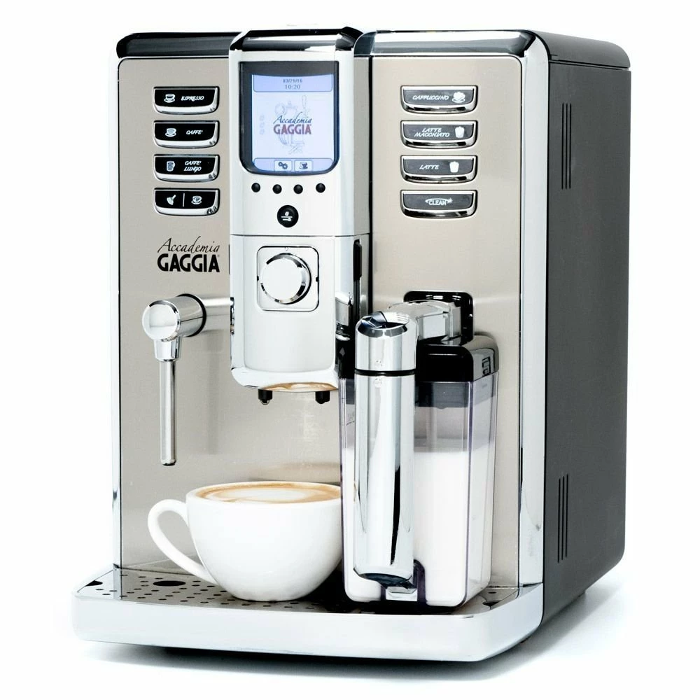 The Gaggia Accademia Espresso Machine Rise through the ranks with the Gaggia Accademia, a smartly appointed super automatic espresso machine, whose charming good looks and responsive performance are sure to earn it place at the top of its class. With a contemporary stainless-steel front panel, durable metal frame, and a bright display, the Accademia embodies refined design aesthetics. Anchored by one-touch, programmable push-button controls for espresso, hot water, and milk outputs, the Accademia dispenses perfect beverages on demand. Just select your desired beverage from one of seven dedicated buttons capable of delivering the following drinks: espresso, caffe, caffe lungo, cappuccino, latte, Latte macchiato and hot water.