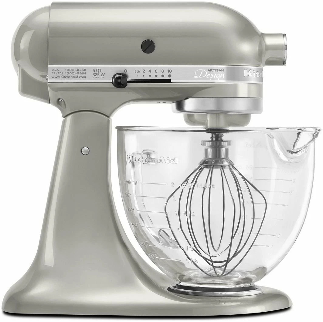 Cook smarter, not harder, with the KitchenAid 5-Quart Designer Mixer in Sugar Pearl. With its easy-to-operate tilt-head design and all metal construction, the KitchenAid Stand Mixer has been a family favorite for decades. This line of Designer Mixers come in flashy, metallic finishes and include a glass bowl with a spout and measurement marks that allow for even easier use!