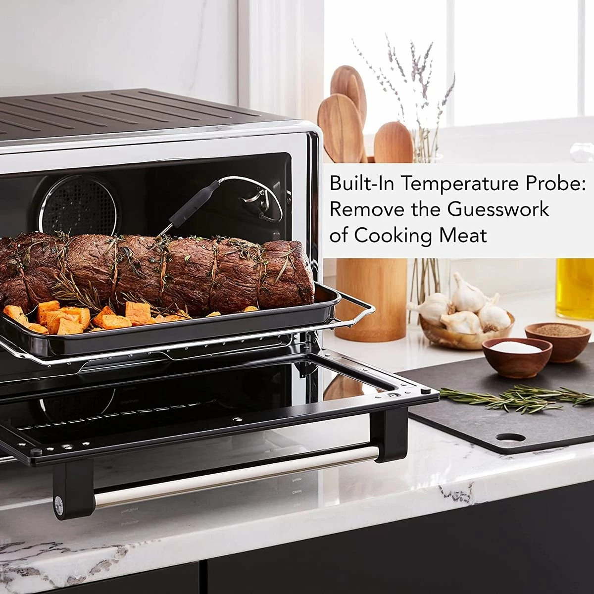 The oven’s large capacity provides enough space to hold a 9×13 baking pan for sheet cakes or one-pan dinners, or even two whole chickens (3.6lbs each)! Never overcook your meat again with the built-in temperature probe to monitor cooking temperature and alert you when your desired cooking temp is reached.