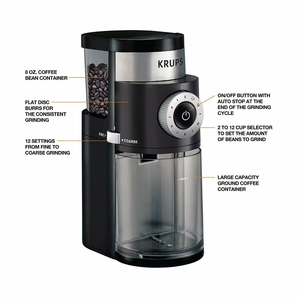 There’s nothing like the smell of freshly ground coffee in the morning. The KRUPS 12-Cup Burr Grinder lets you enjoy the lingering smell of your favorite blend that you’ll soon turn into a satisfying cup of coffee. Regardless of your style – Espresso, French Press, Drip, Pour Over – this highly reliable electric grinder will fine-tune your coffee with 12 grind settings ranging from fine to coarse. Dark roast to light, Arabica bean to Excelsa, Ethiopian origin to Brazilian, the flat burr grinding disks will maximize your coffee’s flavor profile. Packed with convenient features, the cup selector allows you to choose between 2 to 12 cups, while the auto-stop function provides full control and safety. Additionally, a large capacity, 8-ounce whole coffee bean hopper and removable grounds container possess the capacity to produce grinds for up to 30-32 cups of coffee. Keeping your grinder clean is essential to achieve the best results in terms of taste. The removable top burr with an embedded cleaning brush allows for smooth and easy cleaning. KRUPS designs robust and precise products that are a pleasure to use, enabling you to achieve the detail in your coffee making that makes all the difference.