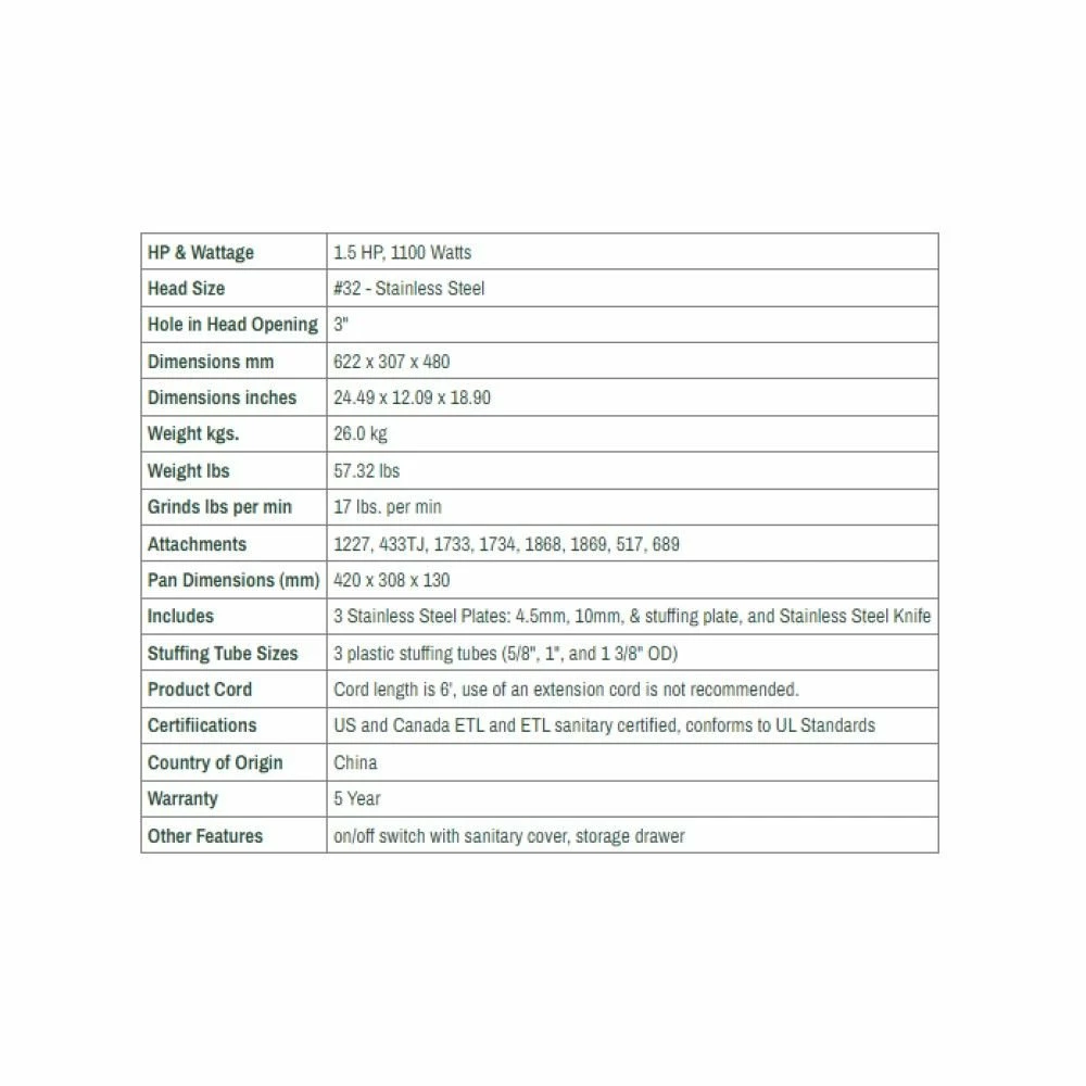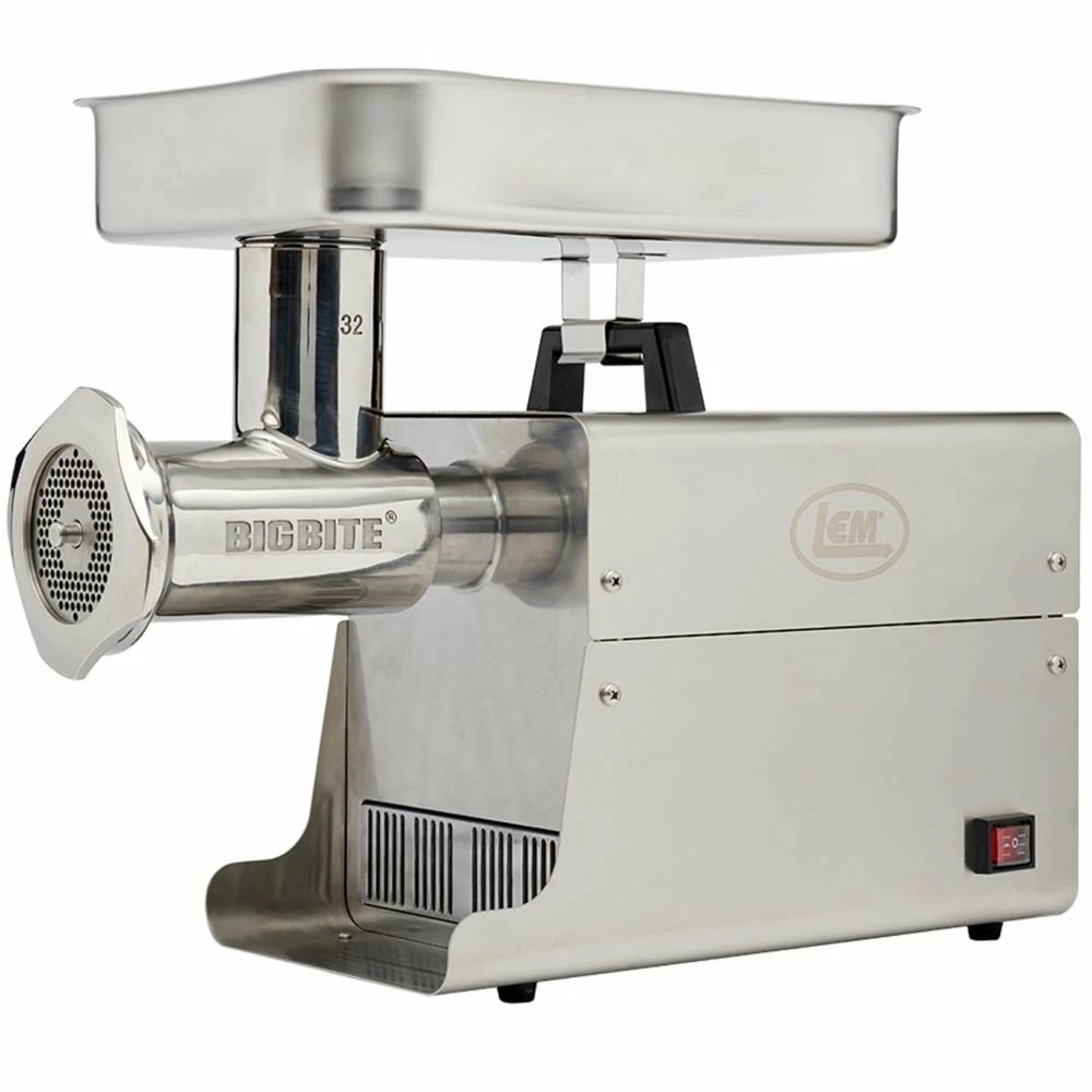 When it’s time to step up from an average kitchen grinder, it’s time for the hefty LEM Big Bite Meat Grinder #32 17821-LEM. This LEM meat grinder is a stocky 1.5-HP and is upgraded and improved with a rifled head, quieter gears, a larger-diameter throat, a meat-pan handguard, and refined performance overall. Designed for heavier grinding tasks, this electric meat grinder grinds a whopping 17 pounds of meat per minute. Features include a stainless steel motor housing, all metal gears with roller bearings, a built-in circuit breaker, and a 1.5-HP induction motor that is permanently lubricated for quiet operation. LEM’s exclusive Big Bite Technology allows the grinder’s auger to grab large chunks of meat and quickly feed them to the grinder head for a superior grind in record time. The rifled head design initiates an enhanced second grind to practically eliminate stomping and improve sausage stuffing. This grinder comes with everything you need to grind beef, pork, wild game, and even raw chicken bones for homemade pet food! The LEM Big Bite Meat Grinder includes a meat stomper, knife, stuffing plate, two grinding plates, three stuffing tubes and a large meat pan with the handguard. LEM covers its improved #32 meat grinder with a 5-year warranty and provides lifetime customer support, so you’re guaranteed to be grinding meat for sausage, jerky, salami, burgers and more for years to come.
