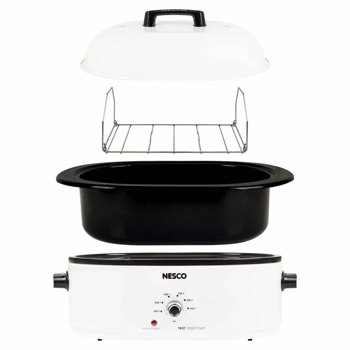 Prepare all your favorite meals quickly and hassle-free with the 18-Quart Roaster from Nesco. With a modern white exterior, this roaster is at home on any kitchen countertop and is designed to perform a versatile range of tasks including roasting, baking, steaming and slow cooking. The powerful 145050 watt base uses “Circle of Heat” technology to produce moist, even results every time, and the dial control allows you to precisely control the temperature between 200°F and 450°F. At 18-quarts, the removable porcelain cookwell is perfect for hosting large gatherings or attending potlucks. The enamel finish ensures that it’s nearly nonstick and easy to clean. Also included is a steel cooking rack with lift-out handles for baking and roasting. Stay-cool side handles make transporting this roaster from kitchen to table or even to events outside the home a breeze, allowing you to serve your delicious meals straight from the source! Whether you’re preparing your famous homemade chili, a mouthwatering pork roast or a delicious glazed ham, the Nesco 18-Quart Roaster is the perfect all-in-one appliance for any home!