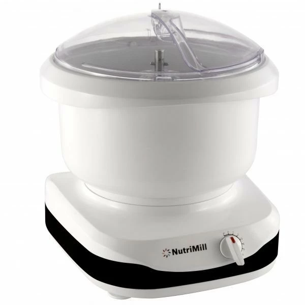 Big power comes in a modern, compact package with the Artiste Complete Stand Mixer from Nutrimill. Lightweight but efficient, this Nutrimill stand mixer in white with black trim comes equipped with a 650-watt bottom drive shaft driven motor. 6 speeds and a pulse setting in combination with either the wire whip or uniquely designed extended dough hook makes short work of mixing or kneading up to 10 lbs of dough. The 5 quart easy grip bowl and see-through splash guard makes it so that you can easily add ingredients during the mixing process and monitor progress. Use in tandem with a Nutrimill Grain Mill to make anything from delicious artisan breads to delicate desserts!
