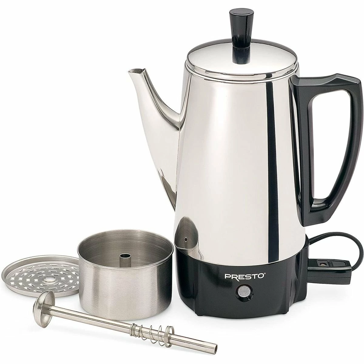 Percolating coffee makers have a long and storied tradition of consistent quality, and are well known for brewing strong coffee. This percolating coffee pot comes with a filter basket and a perk tube, all made of durable stainless steel with a beautiful, classic silver finish and a traditional shape. The easy-pour spout makes it easy to avoid spills and messes and the electric element features a simple signal light alerts you when the coffee is ready to serve! The pot will automatically stay hot after brewing to keep your coffee steamy.