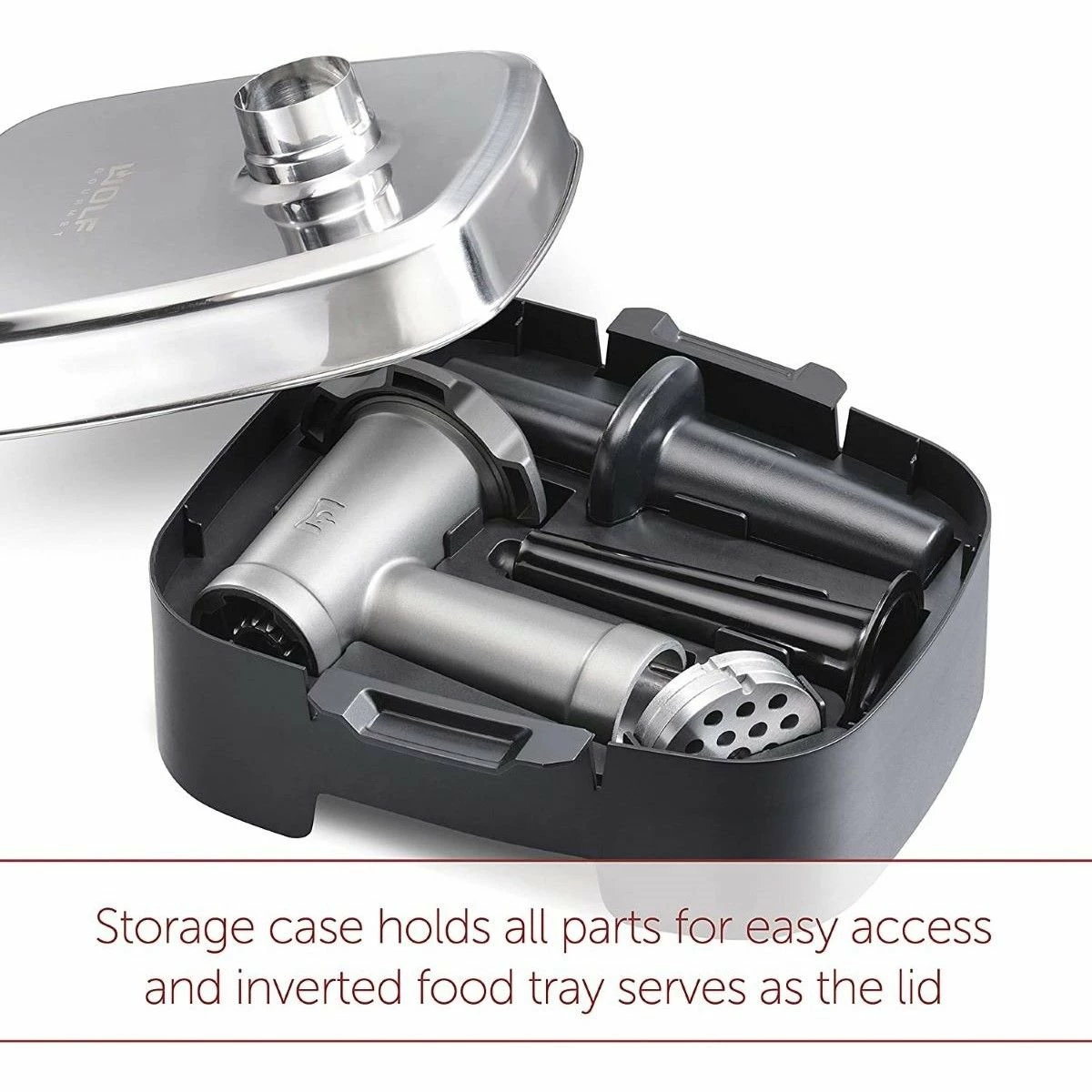 Delicious, classic sausage links, minced and ground meat for burgers, and even fruit preserves shouldn’t be out of your reach! Greatly expand your cooking abilities and the functions of your Wolf Gourmet Stand Mixer. Start making your favorite recipes in the confidence with the Wolf Gourmet Food Grinder Attachment for the Wolf Gourmet Stand Mixer! The Wolf Gourmet Food Grinder Attachment comes with everything you need to get started. This grinder includes: a Fine Grinding Disc, a Medium Grinding Disc, a Course Grinding Disc, a Food Pusher, a Sausage Disc and Stuffer Funnel, the Grinder Base, and a Convenient Storage Case that holds all the parts! The case allows for incredibly easy storage, and the discs will have you making fantastic homemade sausages and more in no time. Why bother with a hand-cranked contraption? Let your mixer do the work for you, no elbow grease required! Hand washing is recommended for this grinder to ensure lastability. Don’t avoid trying out new recipes and don’t limit yourself! Branch out with sausages, fruit preserves and more. Order your very own Wolf Gourmet Stand Mixer Food Grinder Attachment today!